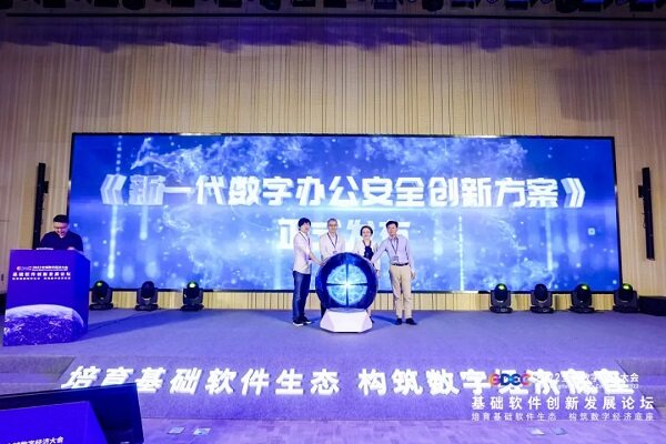 會(huì)上,統(tǒng)信軟件總經(jīng)理劉聞歡、龍芯中科董事長(zhǎng)胡偉武、金山辦公高級(jí)副總裁肖玢、同方計(jì)算機(jī)副總經(jīng)理王悅共同發(fā)布《新一代數(shù)字辦公安全創(chuàng)新方案》。