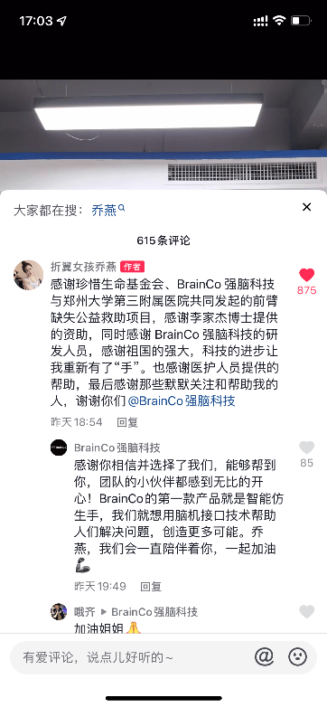 今年7月,喬燕接觸到了珍惜生命基金會、BrainCo 強腦科技與鄭州大學(xué)第三附屬醫(yī)院共同發(fā)起的前臂缺失公益救助項目,在基金會的資助下,她來到鄭州免費安裝了BrainRobotics智能仿生手。為了使仿生手更靈敏地接收信號,工作人員為喬燕重新制作了接收腔,喬燕激動地向網(wǎng)友們分享了這個消息:“等我的翅膀完全裝好之后,就給你們表演,它真的很酷!”幾天之后,屬于喬燕的智能仿生手成功定制好了,看著視頻中用仿生手手指夾取積木的喬燕,不少網(wǎng)友在為她感到開心的同時也很好奇她是如何控制仿生手的。