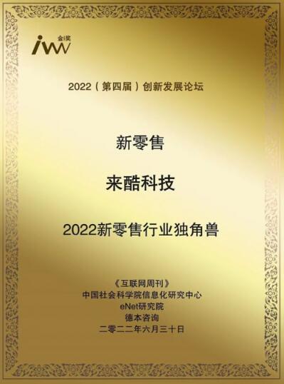 在2022年6月的“2022(第四屆)創(chuàng)新發(fā)展論壇”上,來酷科技當仁不讓地斬獲2022年新零售行業(yè)獨角獸榮譽。這既是數(shù)字化領域權(quán)威研究機構(gòu)和主流媒體對來酷科技推動新零售行業(yè)實現(xiàn)智慧升級成果和貢獻的高度認可,也是對來酷科技創(chuàng)新理念和卓越業(yè)績的肯定和激勵。