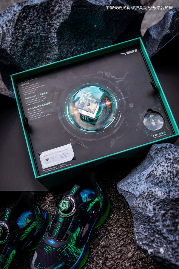 除常規(guī)款UFO4.0系列鞋服外,安踏兒童還重磅推出了首款與中國天眼聯(lián)名的尖貨跑鞋 -- UFO4.0夜光版跑鞋,并限量發(fā)售200套"大開天眼"禮盒,內(nèi)附一枚鐵隕石。這些隕石彌足珍貴:首先是數(shù)量稀缺,一整批只有200個(gè),其次是權(quán)威認(rèn)證,贈(zèng)品中的隕石都是在1576年發(fā)現(xiàn)于阿根廷、在地球已經(jīng)存在4000多年歷史的"珍藏版",不僅有獨(dú)一無二的編號,也有"國際流星協(xié)會(huì)"的證書,與禮盒內(nèi)附贈(zèng)的觀星器,一同激發(fā)孩子們對宇宙的探索的探索之心,讓好奇心永不止步。