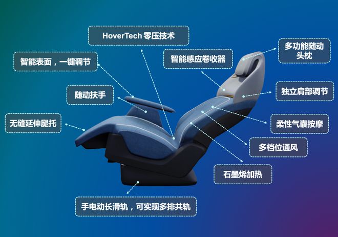 獨立肩部調(diào)節(jié)+石墨烯加熱+多檔位通風(fēng)+柔性氣袋按摩+無縫一體式腿托全面支撐+隨動頭枕,一鍵調(diào)節(jié)零壓坐姿,自動匹配乘員身高體型及自動進(jìn)行四個方向的電動調(diào)節(jié)。 座墊尺寸優(yōu)化、坐深一步到位,滿足各類身材,實現(xiàn)智能沉浸式體驗。