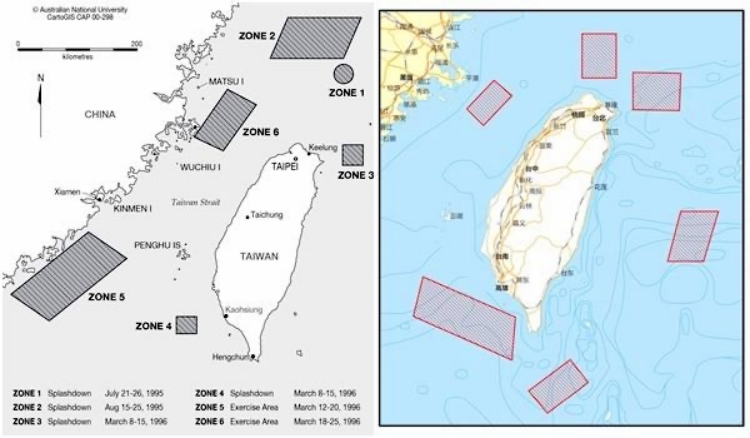 1996年臺海危機與解放軍2日宣布演習(xí)范圍的對照圖。(照片:截取自M. Taylor Fravel Twitter) 圖片來源:香港“中評社”