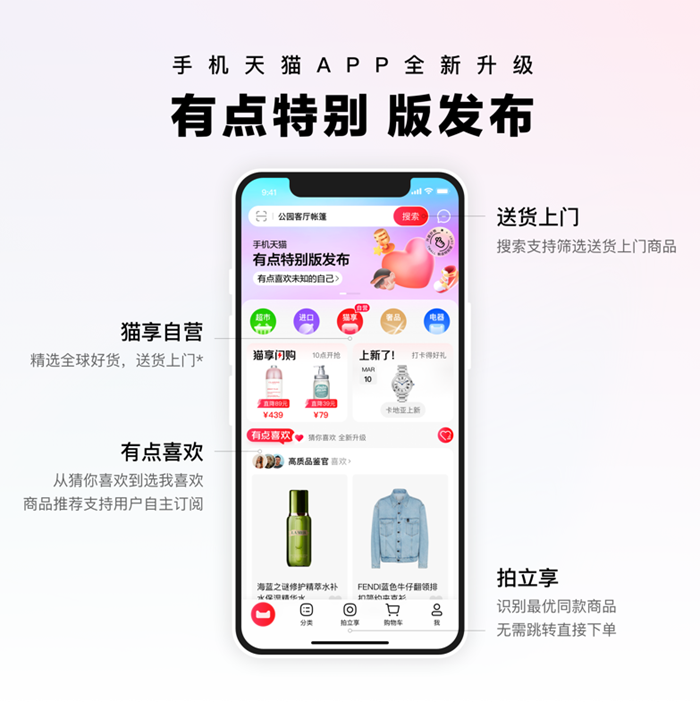 8月4日,手機(jī)天貓App全新升級(jí),發(fā)布“有點(diǎn)特別版”,新版App首頁(yè)采用當(dāng)下流行的極簡(jiǎn)風(fēng),商品推薦不再“猜你喜歡”,用戶可自主訂閱興趣標(biāo)簽;升級(jí)后“拍立享”拍圖找貨功能,從推薦多款到只推薦最優(yōu)一款;同時(shí),搜索支持篩選送貨上門商品,圍繞用戶體驗(yàn)全面升級(jí)。