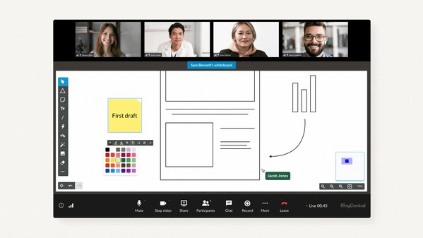 RingCentral Rooms的白板功能:RingCentral Rooms的白板功能允許用戶與其他參與者共同創(chuàng)建和協(xié)作。無論他們是在會議室還是在家辦公,都可以使用白板的沉浸式、近乎無限的畫布,使用數(shù)字便簽和形狀可以輕松地注釋和組織想法。
