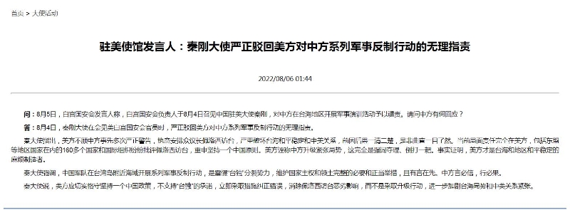 答:8月4日,秦剛大使在會(huì)見美白宮國(guó)安會(huì)官員時(shí),嚴(yán)正駁回美方對(duì)中方系列軍事反制行動(dòng)的無理指責(zé)。