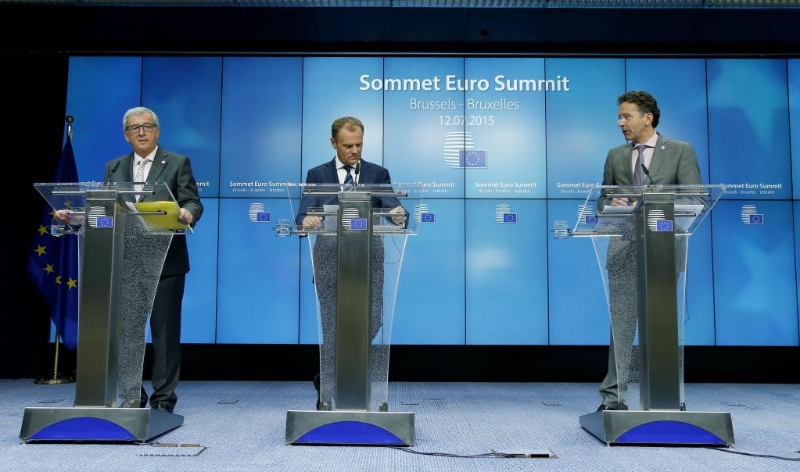 2015年7月13日,在比利時首都布魯塞爾,時任歐洲理事會主席圖斯克(中)、時任歐盟委員會主席容克(左)與時任歐元集團(tuán)主席戴塞爾布盧姆在歐元區(qū)領(lǐng)導(dǎo)人峰會結(jié)束后出席新聞發(fā)布會。經(jīng)過17小時談判,歐元區(qū)領(lǐng)導(dǎo)人峰會當(dāng)天就希臘債務(wù)問題達(dá)成協(xié)議。新華社記者周磊攝