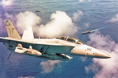 在力量運用上,美各軍種電磁戰(zhàn)力量常態(tài)與其他兵種混編使用。美空軍電磁干擾部隊、反輻射攻擊部隊和電子偵察情報部隊通常一體行動,承擔電磁戰(zhàn)“軟殺傷”任務的同時,用反輻射導彈對目標進行“硬殺傷”。美海軍各航母打擊大隊編入1支裝備6架EA-18G電子攻擊機的電子戰(zhàn)小隊。EA-18G電子攻擊機作戰(zhàn)半徑可達1750千米,能夠對戰(zhàn)場電磁輻射源進行探測定位,并壓制和干擾防空系統(tǒng)的運轉。該機主要配備“哈姆”高速反輻射導彈,可探測、追蹤對方雷達發(fā)射波,對防空系統(tǒng)實施摧毀。