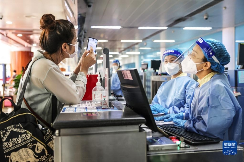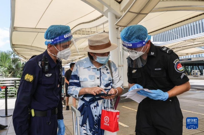 8月14日,海口美蘭機(jī)場(chǎng)的工作人員查驗(yàn)旅客的核酸信息。