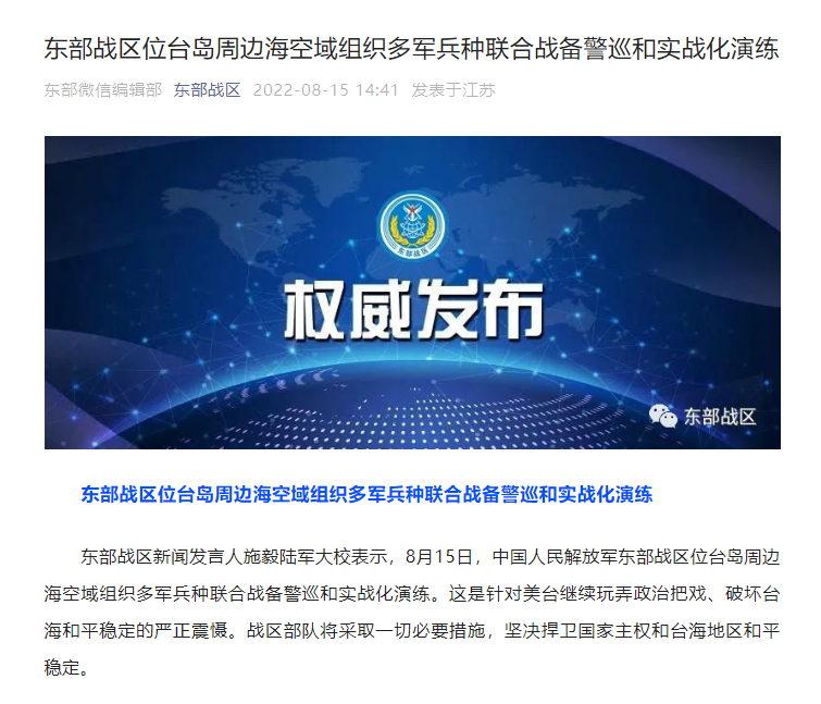 東部戰(zhàn)區(qū)新聞發(fā)言人施毅陸軍大校表示,8月15日,中國(guó)人民解放軍東部戰(zhàn)區(qū)位臺(tái)島周邊??沼蚪M織多軍兵種聯(lián)合戰(zhàn)備警巡和實(shí)戰(zhàn)化演練。這是針對(duì)美臺(tái)繼續(xù)玩弄政治把戲、破壞臺(tái)海和平穩(wěn)定的嚴(yán)正震懾。戰(zhàn)區(qū)部隊(duì)將采取一切必要措施,堅(jiān)決捍衛(wèi)國(guó)家主權(quán)和臺(tái)海地區(qū)和平穩(wěn)定?! ?/p>