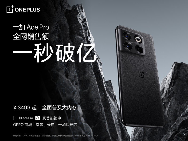 8月15日上午10點(diǎn),一加 Ace Pro 全渠道正式開售,首銷即斬獲全網(wǎng)銷售額1秒破億的佳績(jī)。一加 Ace Pro一經(jīng)發(fā)布便大受好評(píng),媒體稱其“將一改往日用戶對(duì)傳統(tǒng)性能手機(jī)‘參數(shù)沒輸過,體驗(yàn)沒贏過’的固有印象”、“是一款真正的性能手機(jī)新標(biāo)桿”。一加 Ace Pro 全系 12GB 起步,至高配備 16 GB 大內(nèi)存,售價(jià)3499元起。一加中國(guó)區(qū)總裁李杰此前就在微博透露,16 GB 版本預(yù)定量占總預(yù)定量的80%以上,充分表明大內(nèi)存是用戶的剛需,大內(nèi)存帶來(lái)的極致體驗(yàn)將會(huì)是“旦用難回”的。