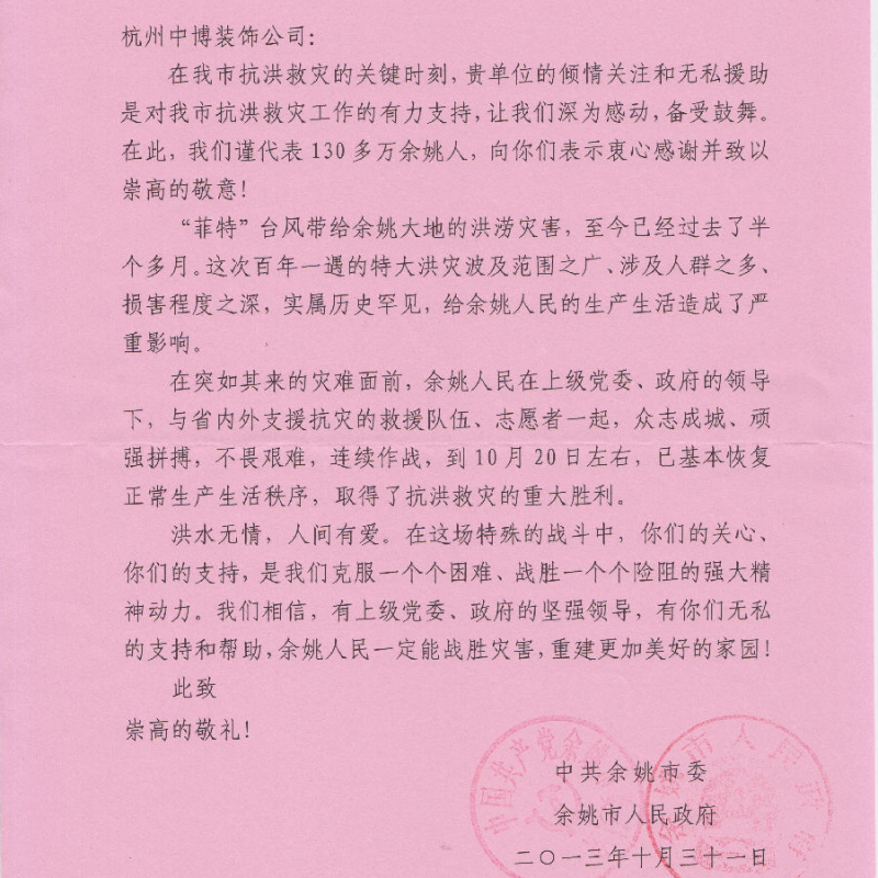中博裝飾始終不忘企業(yè)的社會責任,在公益路上永不停歇,在歷年的重大社會災害中,都帶領全體員工捐款捐物、或參加各種志愿活動:2013年奔赴余姚洪災一線賑災;