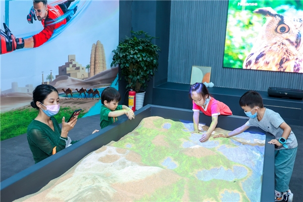 在沙盤互動(dòng)區(qū),當(dāng)觀眾改變沙子高度時(shí),相應(yīng)的圖像也會(huì)隨之發(fā)生奇妙變化,實(shí)現(xiàn)生動(dòng)立體的視覺(jué)體驗(yàn)。這樣逼真的3D效果,源于海信4K激光工程投影機(jī)P60結(jié)合混合現(xiàn)實(shí)(MR)技術(shù),實(shí)現(xiàn)了超清沉浸式人機(jī)交互體驗(yàn),同時(shí)輸出4K高清畫(huà)質(zhì),識(shí)別及反饋?lái)憫?yīng)時(shí)間低于0.1s,實(shí)現(xiàn)了完美的3D場(chǎng)景及特效實(shí)時(shí)渲染。