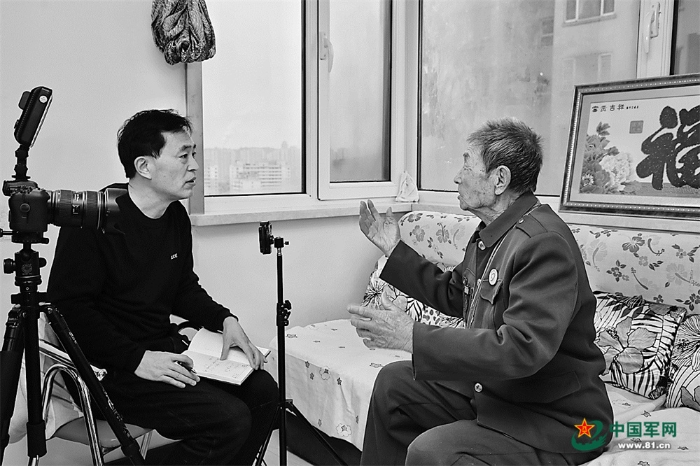 《銘記》紀(jì)錄片工作組人員尋訪抗美援朝老兵王永明。劉先寬攝