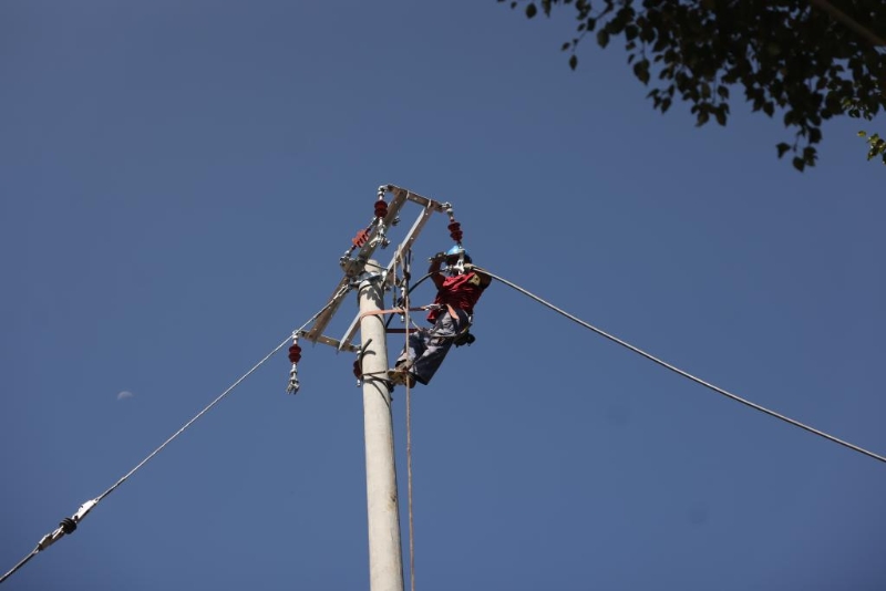 8月20日,在青海省西寧市大通回族土族自治縣青山鄉(xiāng)沙岱村,西寧電力實業(yè)有限公司職工在檢修電路。(新華社記者李寧 攝)