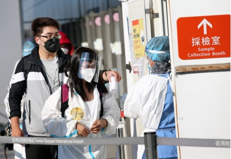 臺(tái)灣地區(qū)自8月22日起調(diào)整入境總量人數(shù),從每周4萬調(diào)升為5萬人次。圖為剛下飛機(jī)的旅客正在排隊(duì)采檢。(圖/來源:臺(tái)灣“中時(shí)新聞網(wǎng)”)