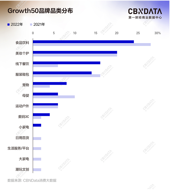 在消費(fèi)者需求不斷細(xì)分多變的當(dāng)下,剛需、高頻的賽道屬性,為食品飲料、美妝個(gè)護(hù)帶來了持久生命力。線下餐飲也因?yàn)楦哳l剛需和難以被線上替代的品類屬性,進(jìn)入Growth50榜單的比例有了大幅提升,超越服飾鞋包成為占比第三的細(xì)分品類。