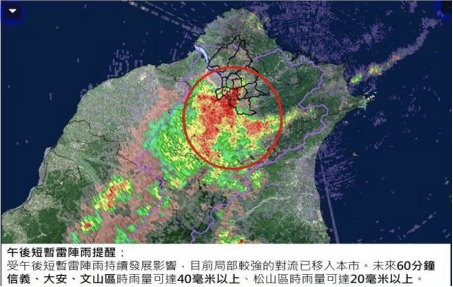 臺北市25日下午下起暴雨,大安區(qū)、信義區(qū)最大時雨量均破100毫米,內(nèi)湖、文山、松山及中山區(qū)時雨量均超過50毫米。