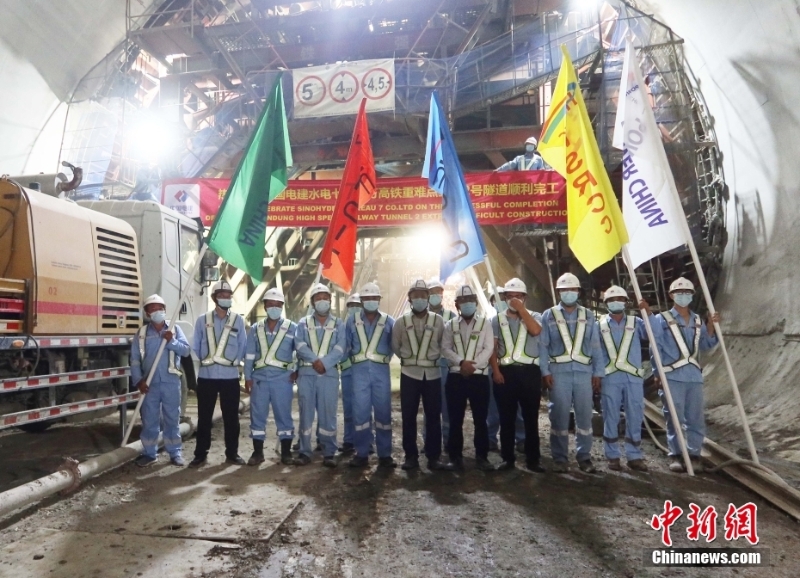 當地時間8月25日,印尼西爪哇省普哇加達縣,隨著最后一板襯砌澆筑完成,雅萬高鐵2號隧道順利完工,全線架梁通道全部貫通。圖為施工人員慶祝完工。 中新社發(fā) 中國電建雅萬高鐵項目部 供圖
