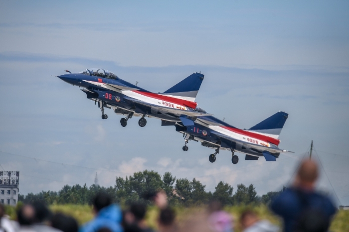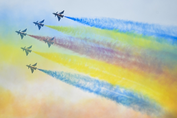 8月26日,在空軍航空開(kāi)放活動(dòng)暨長(zhǎng)春航空展上,中國(guó)空軍“八一”飛行表演隊(duì)進(jìn)行飛行表演。新華社記者 許暢 攝