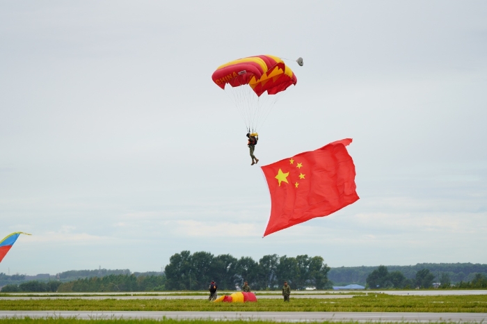 8月26日,在空軍航空開(kāi)放活動(dòng)暨長(zhǎng)春航空展上,八一跳傘隊(duì)進(jìn)行跳傘表演。新華社發(fā)(時(shí)旭琛 攝)