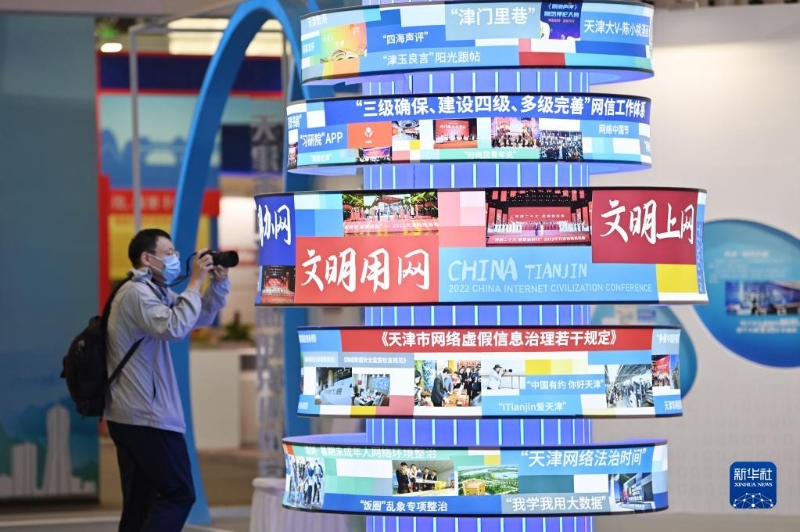 8月28日,在國家會展中心(天津),參會者在2022年中國網(wǎng)絡(luò)文明大會現(xiàn)場拍攝展覽。新華社記者 李然 攝