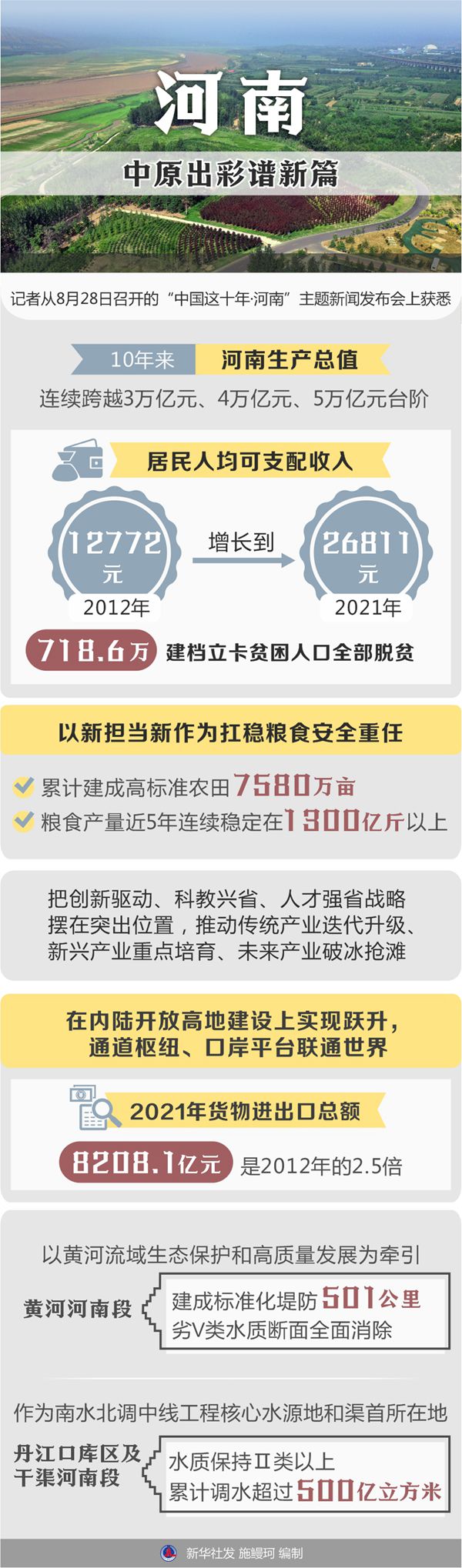 10年來,河南生產(chǎn)總值連續(xù)跨越3萬億元、4萬億元、5萬億元臺(tái)階,居民人均可支配收入從2012年的12772元增長到2021年的26811元,718.6萬建檔立卡貧困人口全部脫貧。