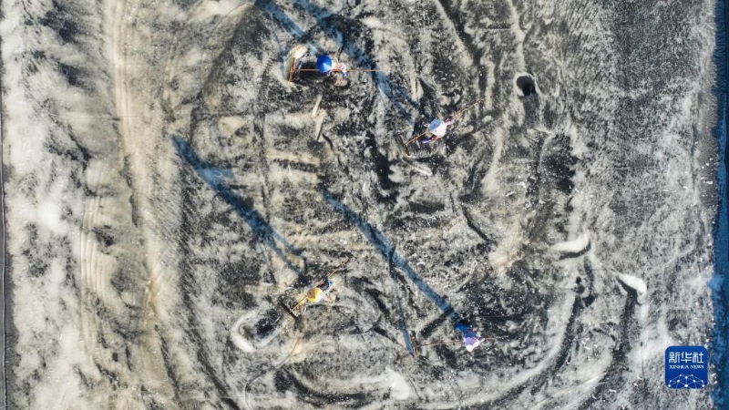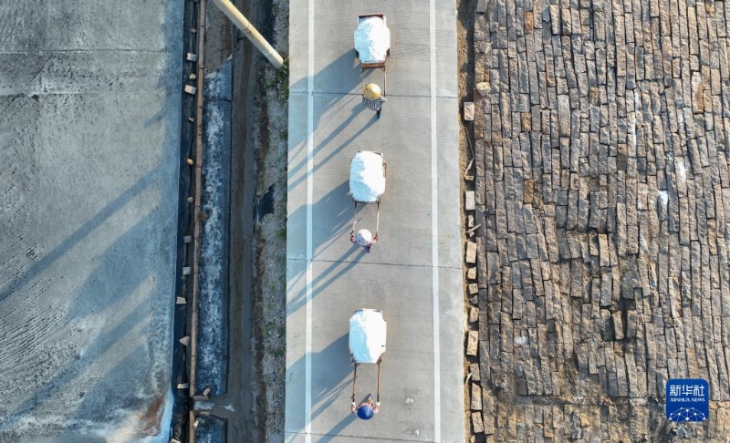 8月26日,在福建省莆田市秀嶼區(qū)東嶠鎮(zhèn)的莆田鹽場,工人們在運輸海鹽(無人機照片)。
