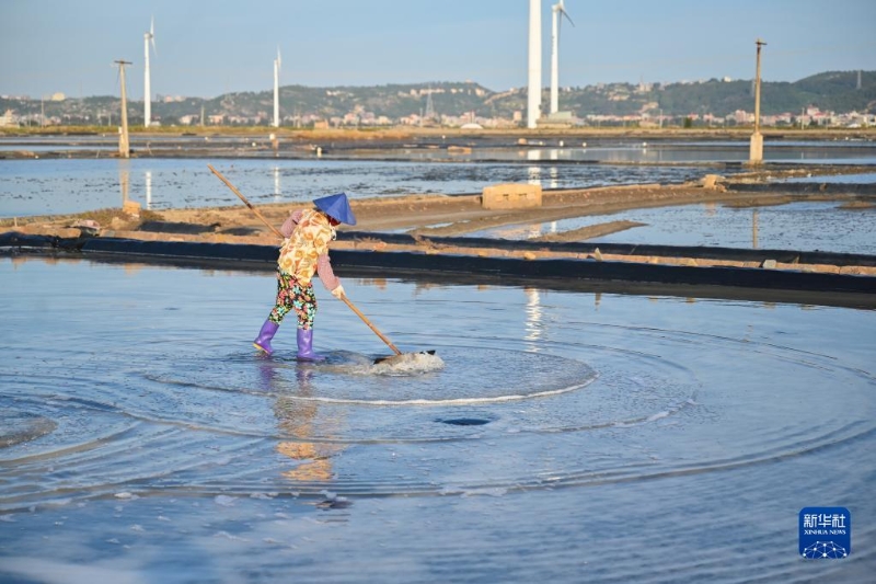 8月26日,在福建省莆田市秀嶼區(qū)東嶠鎮(zhèn)的莆田鹽場,工人在鹽田里扒鹽。