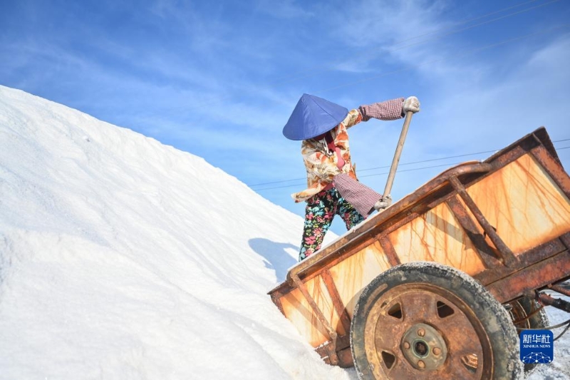 8月26日,在福建省莆田市秀嶼區(qū)東嶠鎮(zhèn)的莆田鹽場,工人鏟出推車里的鹽。