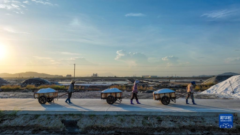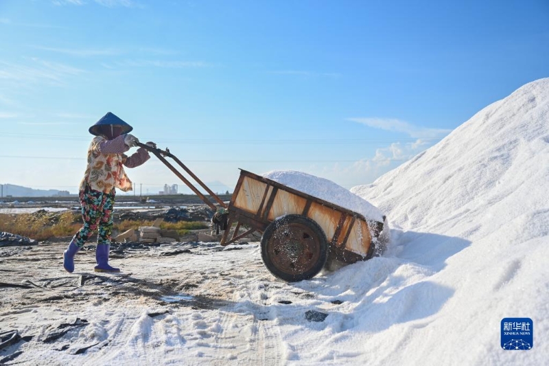 8月26日,在福建省莆田市秀嶼區(qū)東嶠鎮(zhèn)的莆田鹽場,工人把推車里的鹽運送至鹽山。