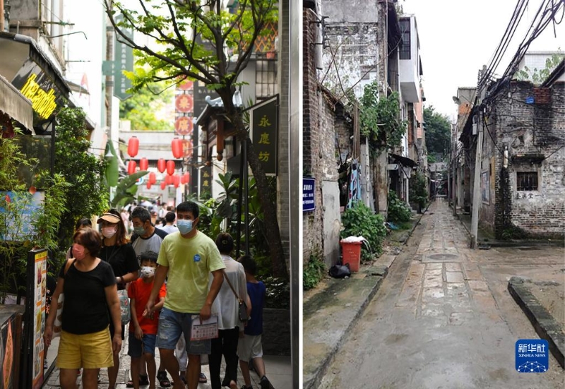 這是一張拼版照片:左圖為2022年7月19日拍攝的廣州永慶坊永慶大街(新華社記者 鄧華 攝);右圖為2015年拍攝的廣州永慶坊永慶大街(廣州市荔灣區(qū)住房建設(shè)和園林局供圖)。