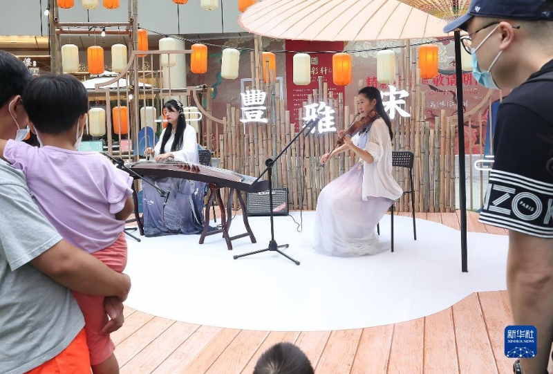 8月28日,游客在欣賞樂器演奏。