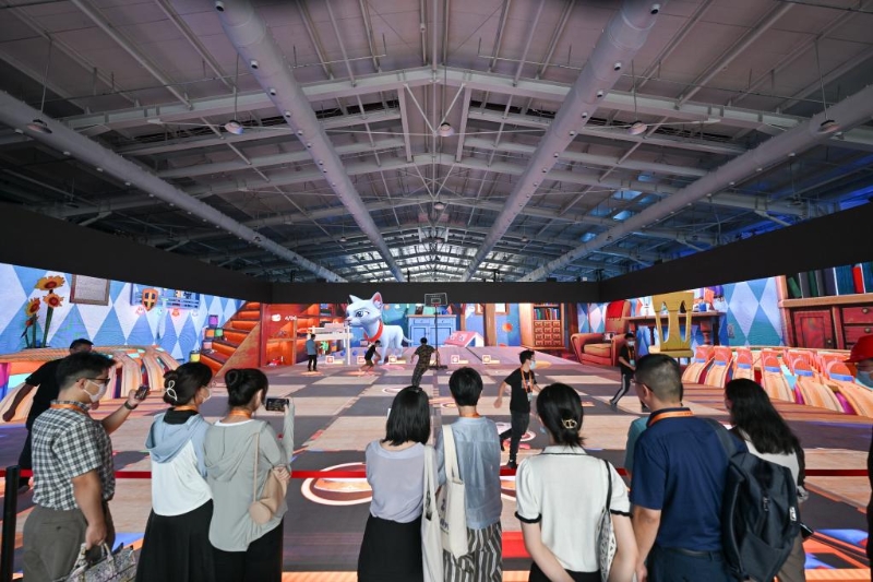 8月29日,人們在服貿(mào)會首鋼園區(qū)的電信、計(jì)算機(jī)和信息服務(wù)展館內(nèi)觀看沉浸式交互應(yīng)用。新華社記者 李鑫 攝