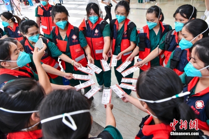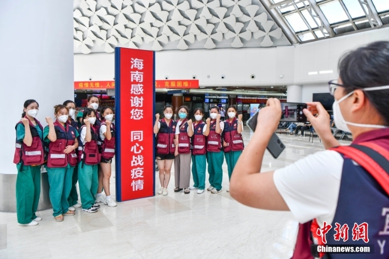 8月29日,福建、四川、山東等多地援瓊醫(yī)療隊(duì)近7000名隊(duì)員從海口陸續(xù)返程。據(jù)了解,自8月初海南發(fā)生本土新冠肺炎疫情以來,共有來自全國(guó)20個(gè)省區(qū)市超2萬余名醫(yī)護(hù)人員馳援海南。當(dāng)前,海南疫情防控形勢(shì)穩(wěn)步向好,社會(huì)面感染者進(jìn)一步減少。自26日起,海南各地援瓊醫(yī)療隊(duì)員開始返程。圖為四川援瓊醫(yī)療隊(duì)隊(duì)員在??诿捞m國(guó)際機(jī)場(chǎng)T1航站樓內(nèi)合影。 中新社記者 駱云飛 攝