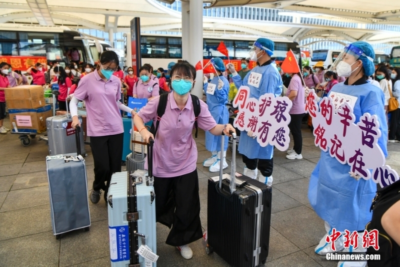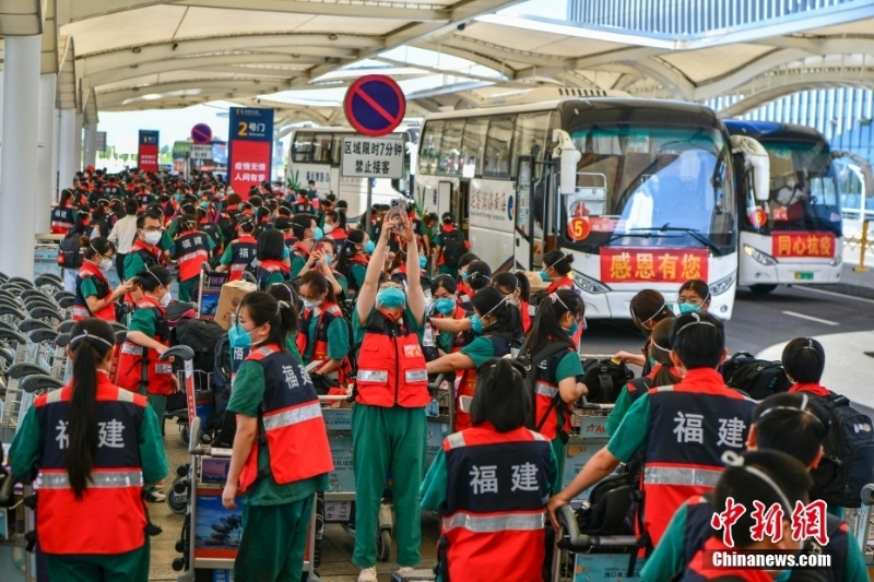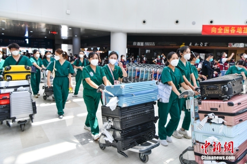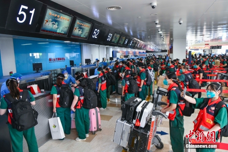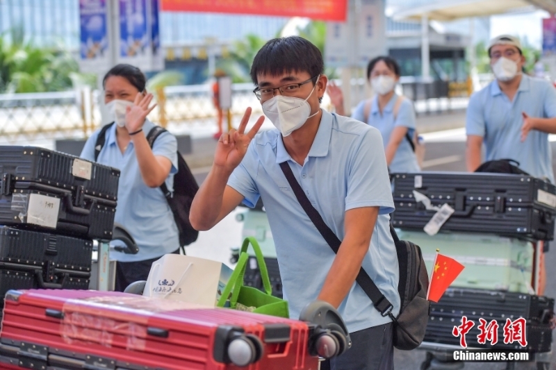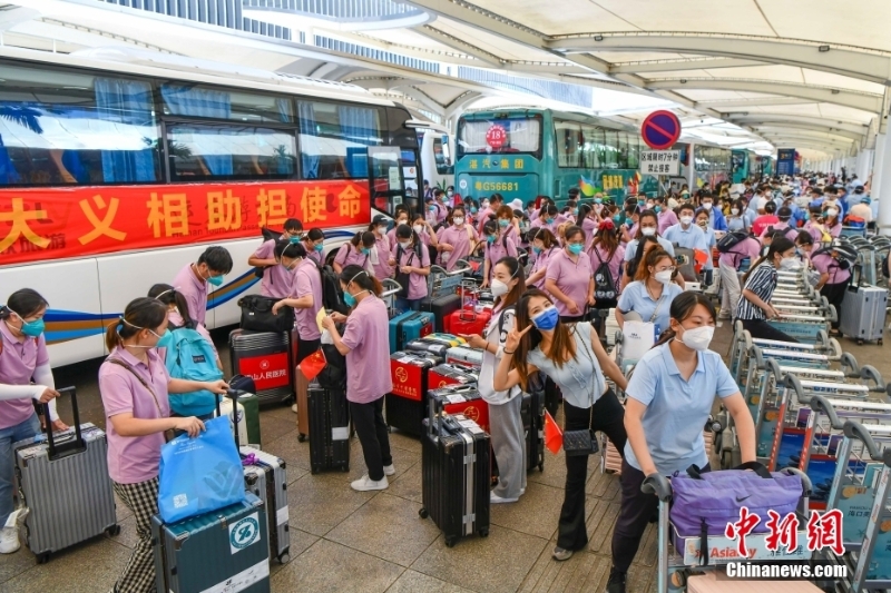8月29日,福建、四川、山東等多地援瓊醫(yī)療隊(duì)近7000名隊(duì)員從??陉懤m(xù)返程。據(jù)了解,自8月初海南發(fā)生本土新冠肺炎疫情以來,共有來自全國(guó)20個(gè)省區(qū)市超2萬余名醫(yī)護(hù)人員馳援海南。當(dāng)前,海南疫情防控形勢(shì)穩(wěn)步向好,社會(huì)面感染者進(jìn)一步減少。自26日起,海南各地援瓊醫(yī)療隊(duì)員開始返程。圖為多個(gè)援瓊醫(yī)療隊(duì)陸續(xù)抵達(dá)??诿捞m國(guó)際機(jī)場(chǎng)。 中新社記者 駱云飛 攝