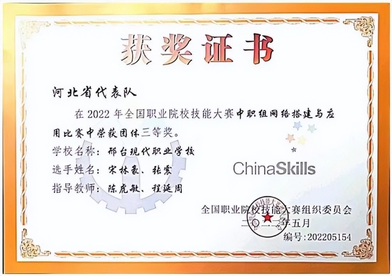 近日,2022年全國職業(yè)院校技能大賽(中職組)網(wǎng)絡(luò)搭建與應(yīng)用賽項在山東濱州舉辦,本項目比賽由來自全國35個省(市、區(qū))的67支代表隊參賽,經(jīng)過八個小時的激烈角逐,由陳虎敏,程延周老師指導的邢臺現(xiàn)代職業(yè)學校計算機網(wǎng)絡(luò)技術(shù)專業(yè)2007班張震、2008班宋林豪兩位同學榮獲團體三等獎。