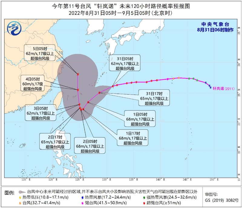 今年第11號(hào)臺(tái)風(fēng)“軒嵐諾”(超強(qiáng)臺(tái)風(fēng)級(jí))的中心今天(31日)早晨5點(diǎn)鐘位于日本沖繩縣那霸市偏東方向約340公里的西北太平洋洋面上,中心附近最大風(fēng)力17級(jí)以上(62米/秒),中心最低氣壓為915百帕,七級(jí)風(fēng)圈半徑220~230公里,十級(jí)風(fēng)圈半徑70公里,十二級(jí)風(fēng)圈半徑40公里。