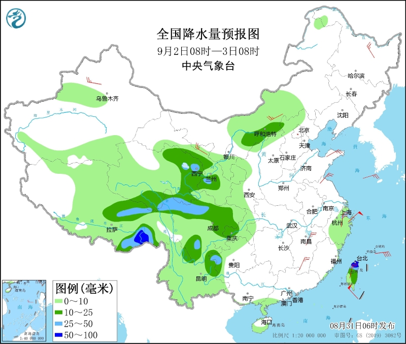 8月31日08時(shí)至9月1日08時(shí),黑龍江西北部、西藏東南部、川西高原、重慶北部、云南中東部和北部、廣西中西部、廣東中部和西南部、浙江中東部、海南島北部和西南部等地部分地區(qū)有中到大雨,其中,四川南部、云南西北部和中東部、廣西西南部、海南島西部等地部分地區(qū)有暴雨(50~70毫米)。內(nèi)蒙古東北部和中部等地部分地區(qū)有4~6級(jí)風(fēng)(見(jiàn)圖2)。臺(tái)灣以東洋面和東海南部海域?qū)⒂?~7級(jí)、陣風(fēng)8~9級(jí)的東北風(fēng)轉(zhuǎn)偏北風(fēng)。