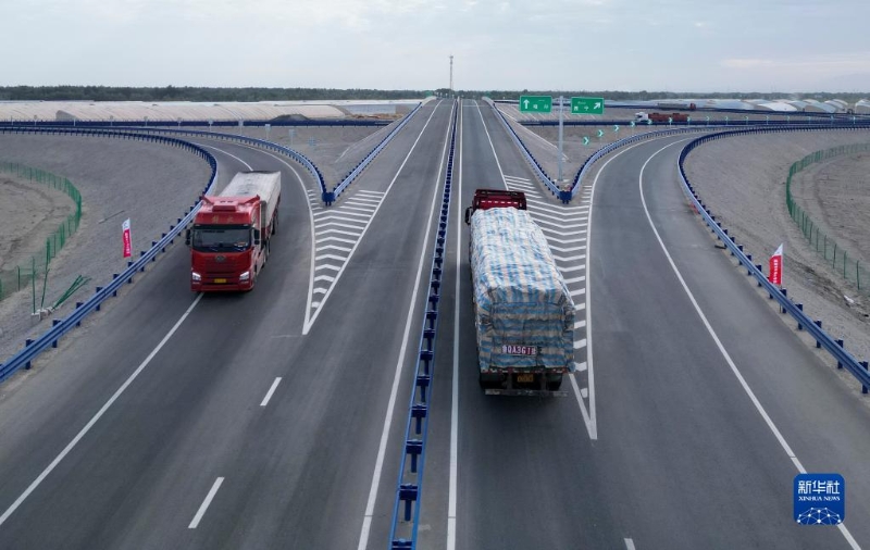 8月30日,車(chē)輛通過(guò)依若高速公路新疆若羌東出入口(無(wú)人機(jī)照片)。新華社發(fā)(阿迪力 攝)