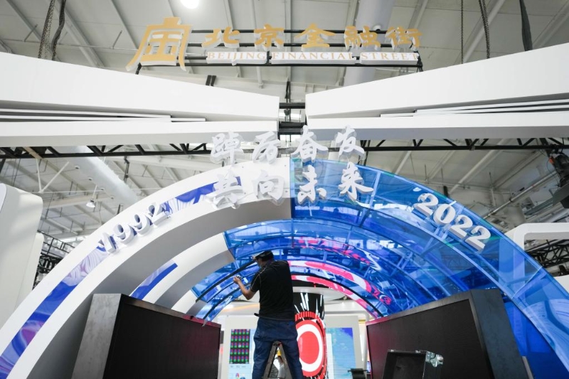 8月29日,在服貿(mào)會(huì)首鋼園區(qū)展館內(nèi),工作人員在布展。2022年中國國際服務(wù)貿(mào)易交易會(huì)將于8月31日至9月5日在位于北京的國家會(huì)議中心和首鋼園區(qū)舉辦。(新華社記者鞠煥宗攝)