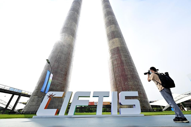 8月29日,參加探營活動(dòng)的媒體記者在首鋼園區(qū)內(nèi)拍攝服貿(mào)會(huì)標(biāo)識(shí)。(新華社記者李鑫攝)