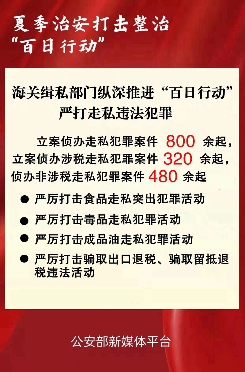 海關總署緝私局負責人表示,全國海關緝私部門將持續(xù)縱深推進“百日行動”,始終保持打擊走私高壓態(tài)勢,聯(lián)合協(xié)同各警種各部門深挖徹查走私關聯(lián)犯罪,以實實在在的打私成績切實維護國家安全和群眾利益。