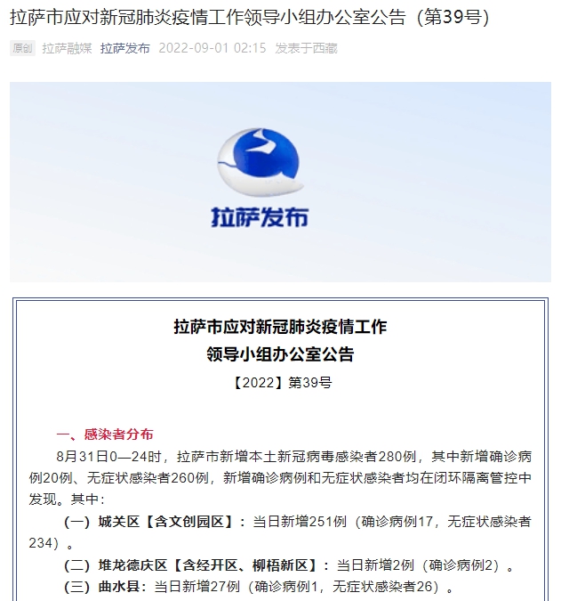 8月31日0—24時,拉薩市新增本土新冠病毒感染者280例,其中新增確診病例20例、無癥狀感染者260例,新增確診病例和無癥狀感染者均在閉環(huán)隔離管控中發(fā)現(xiàn)。其中: