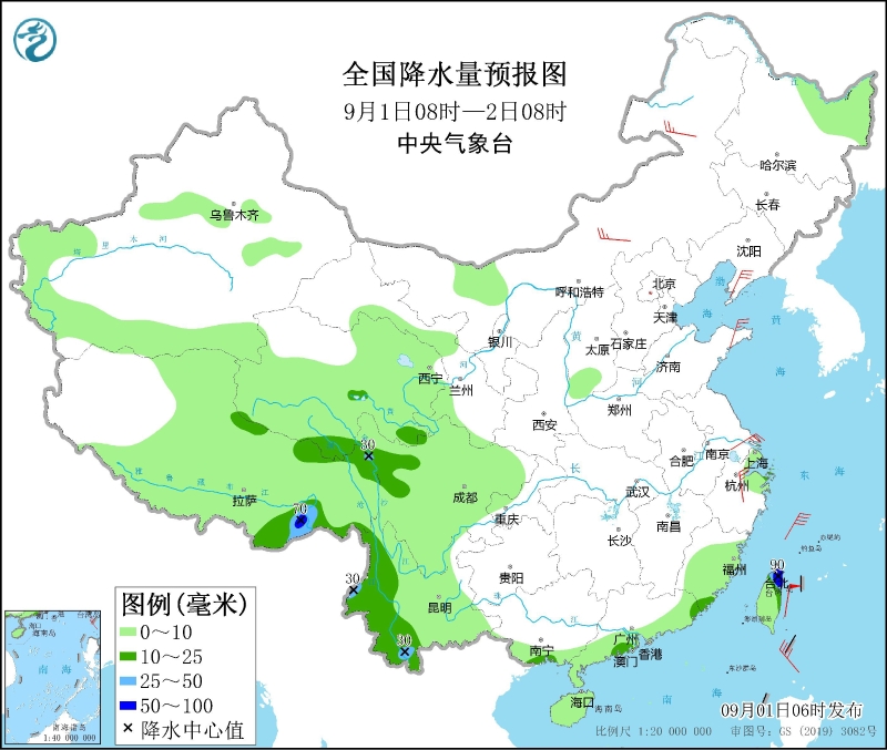 9月1日08時至2日08時,西藏東部和南部、青海南部、川西高原北部、云南西部、臺灣島等地部分地區(qū)有中到大雨,其中,西藏東南部、臺灣島北部和東部等地部分地區(qū)有暴雨(50~90毫米)。內(nèi)蒙古東北部和中部、遼東半島、山東半島、江蘇中部、浙江北部等地部分地區(qū)有4~6級風(見圖2)。臺灣以東洋面將有7~8級、陣風9級的偏北風,東海南部海域、臺灣海峽將有6~7級、陣風8級的偏北到東北風,巴士海峽將有6~7級、陣風8級的偏西風轉(zhuǎn)西北風。