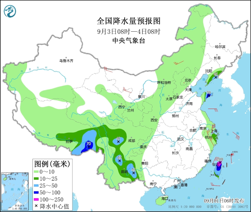 9月3日08時至4日08時,西藏東部、川西高原、云南中東部、遼寧東部、山東半島、浙江東部、臺灣島等地部分地區(qū)有中到大雨,其中,西藏東南部、山東半島、臺灣島中北部等地部分地區(qū)有暴雨或大暴雨(100~200毫米)。內(nèi)蒙古中部和西部、甘肅河西、上海、浙江等地部分地區(qū)有4~6級風(見圖4)。東海南部海域?qū)⒂?~8級、陣風9級的偏東風轉(zhuǎn)11~12級、陣風13級的旋轉(zhuǎn)風,臺灣以東洋面將有11~12級、陣風13級的旋轉(zhuǎn)風轉(zhuǎn)9~10級、陣風11級的偏西風。