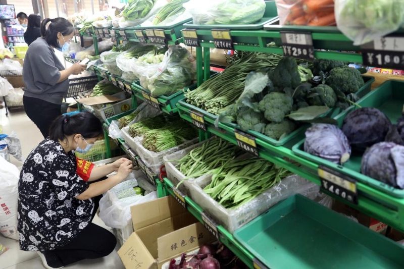 8月30日,石家莊市裕華區(qū)一家社區(qū)超市工作人員在整理打包居民線上訂購的蔬菜。新華社記者 駱學峰 攝