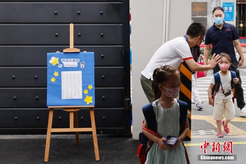 9月1日,在上海新世紀(jì)虹橋幼兒園,老師迎接孩子們的到來。當(dāng)日,上海中小學(xué)、托幼機(jī)構(gòu)正式開學(xué)。 中新社記者 殷立勤 攝