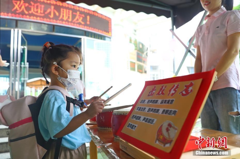 9月1日,江西南昌的中小學(xué)、幼兒園迎來開學(xué)季,學(xué)生走進(jìn)校園,開啟新學(xué)期。圖為江西南昌紅谷灘紅嶺幼兒園,抵達(dá)校園的小朋友正在敲擊圓鼓,意為“擊鼓傳志”。劉占昆 攝