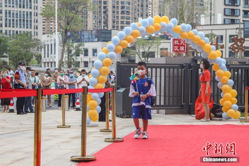南昌市郵政路小學(xué)(天驥校區(qū)) ,一位一年級(jí)新生手持風(fēng)車走過紅毯進(jìn)入校園,校門外聚集著不少家長(zhǎng)。劉力鑫 攝