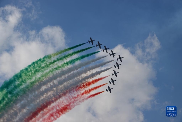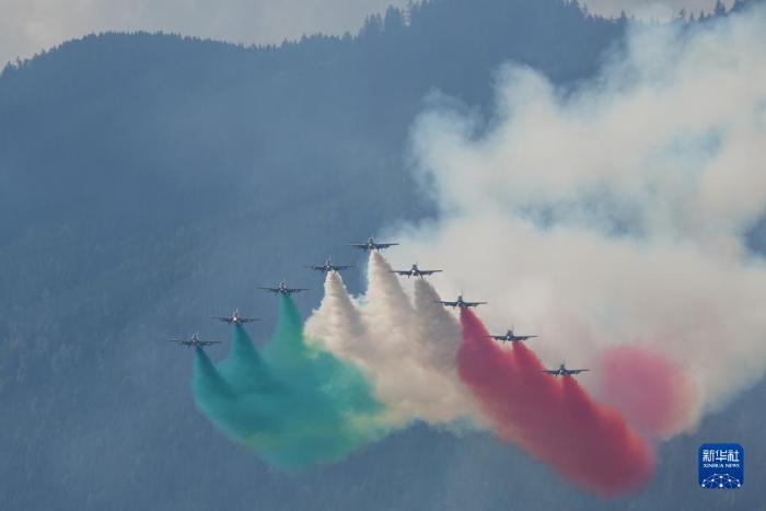 9月2日,意大利“三色箭”飛行表演隊(duì)在奧地利“空中力量-2022”航展上表演。